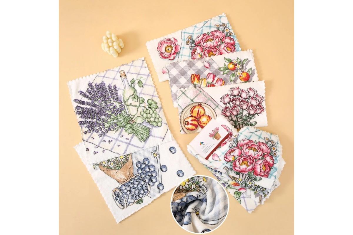 Салфетки и прихватки производятся из таких популярных материалов, как хлопок, махра, микрофибра. Эти ткани обладают прекрасной износостойкостью и долговечностью, способны хорошо впитывать влагу, экологически безопасные и не вызывают аллергии.