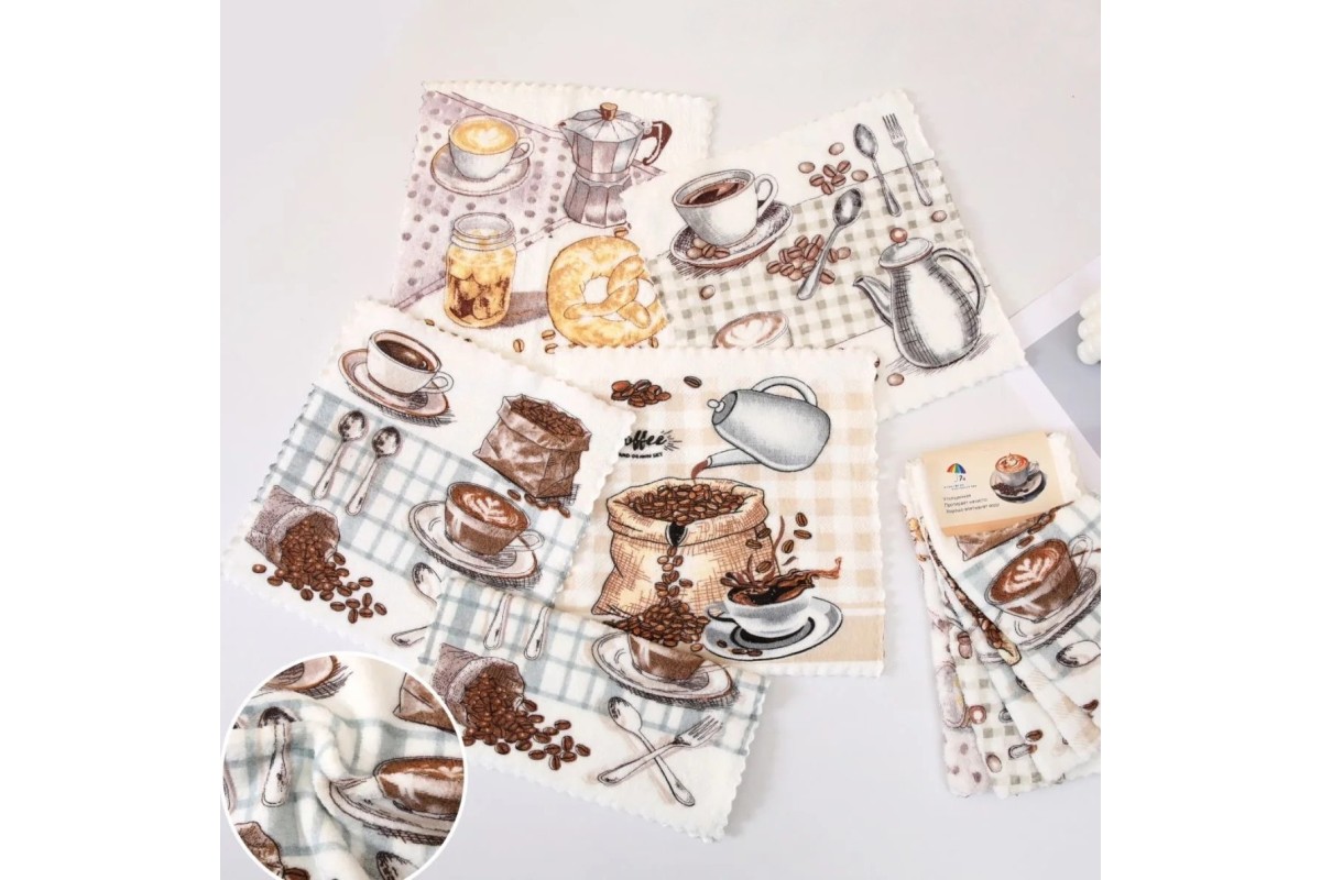Салфетки и прихватки производятся из таких популярных материалов, как хлопок, махра, микрофибра. Эти ткани обладают прекрасной износостойкостью и долговечностью, способны хорошо впитывать влагу, экологически безопасные и не вызывают аллергии.